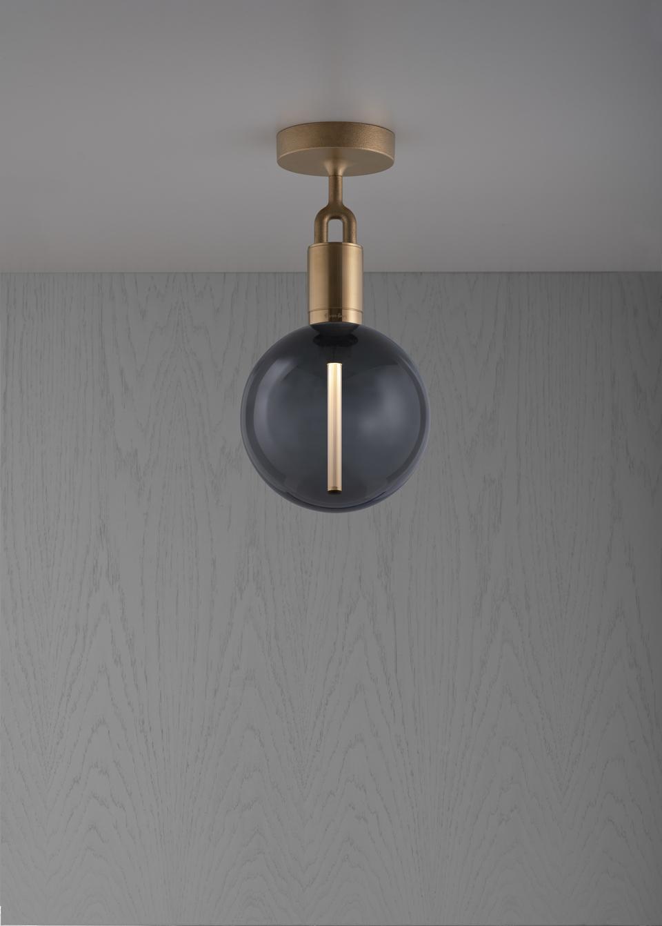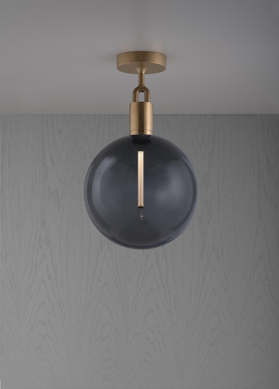 Un plafonnier, alliant métal massif usiné et coulé, le tout affiné à la main. Il présente nos détails fourchus moulés et notre moletage linéaire taillé au diamant. La lumière est livrée avec un globe en verre smoked soufflé à la bouche et une ampoule Buster à intensité variable spécifique à la fourche, projetant une lumière ambiante fonctionnelle dans cette configuration.