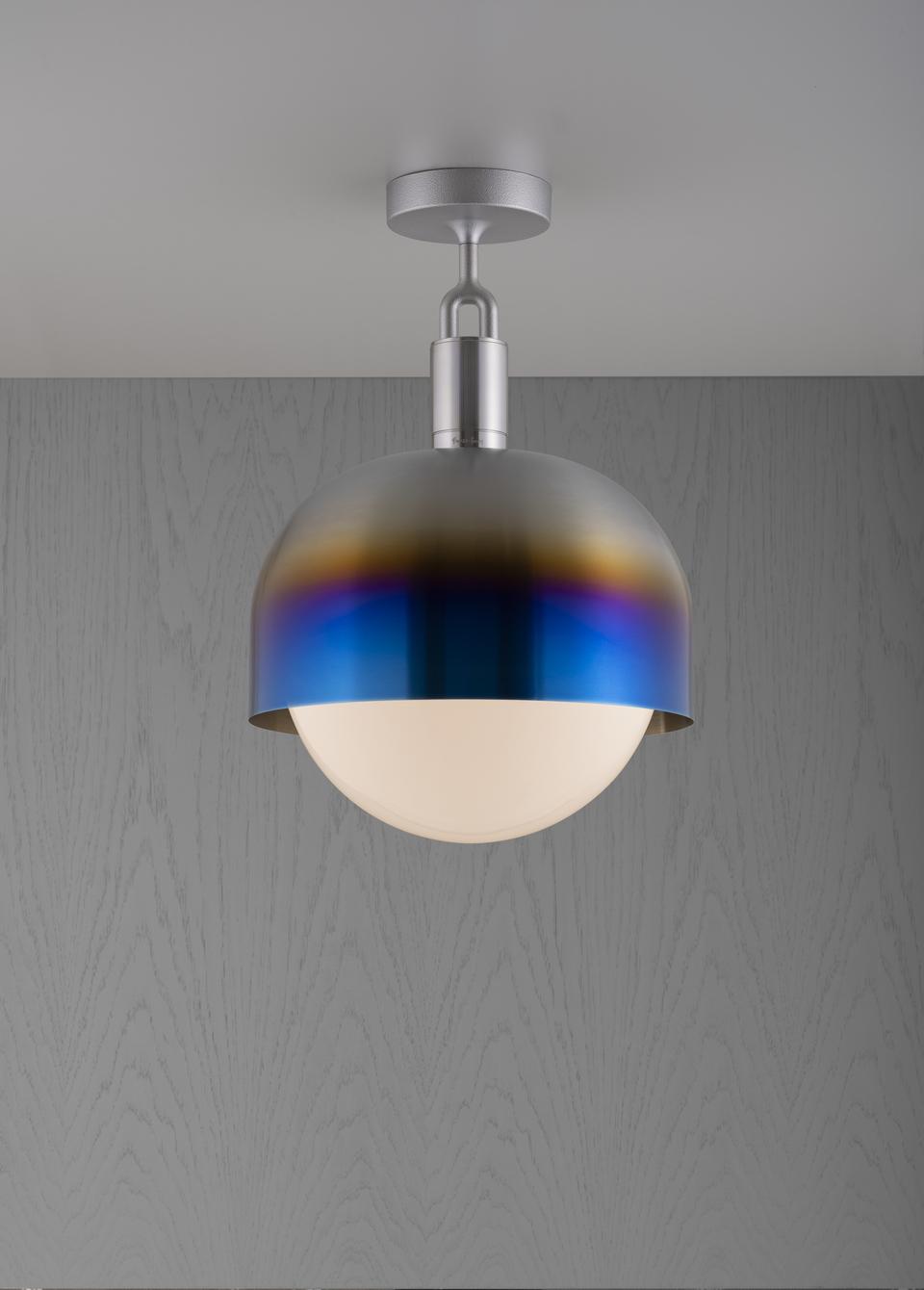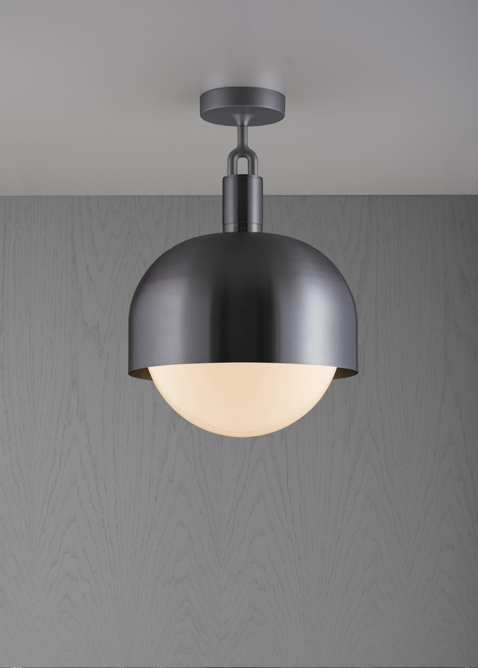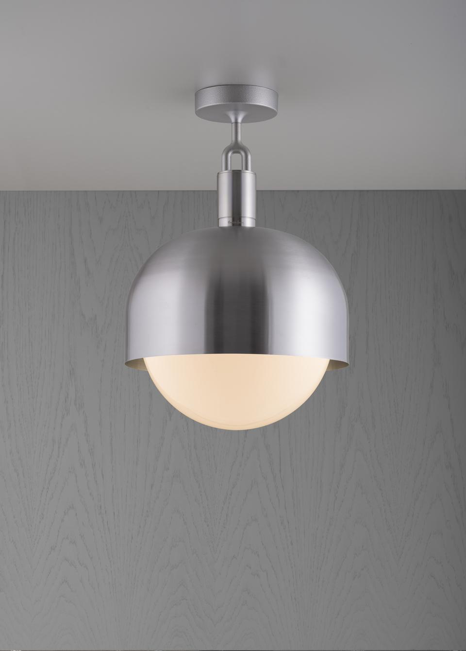 Un plafonnier et un abat-jour, combinant du métal massif usiné, filé à la main et coulé, le tout affiné à la main. Il présente nos détails fourchus moulés et notre moletage linéaire taillé au diamant. La lumière est livrée avec un globe en verre opal soufflé à la bouche et une ampoule Buster à intensité variable spécifique à la fourche, projetant une douce lueur décorative dans cette configuration.