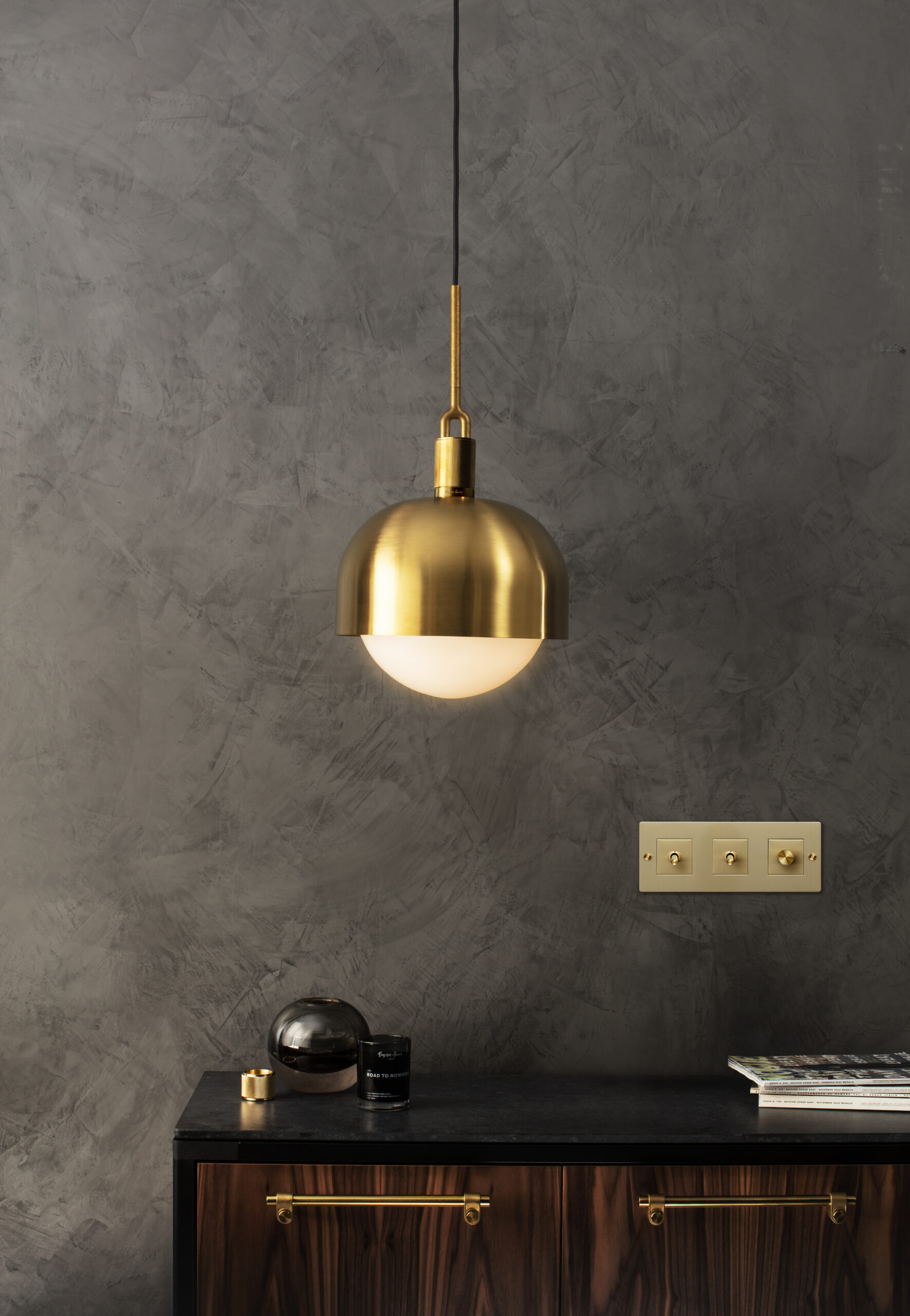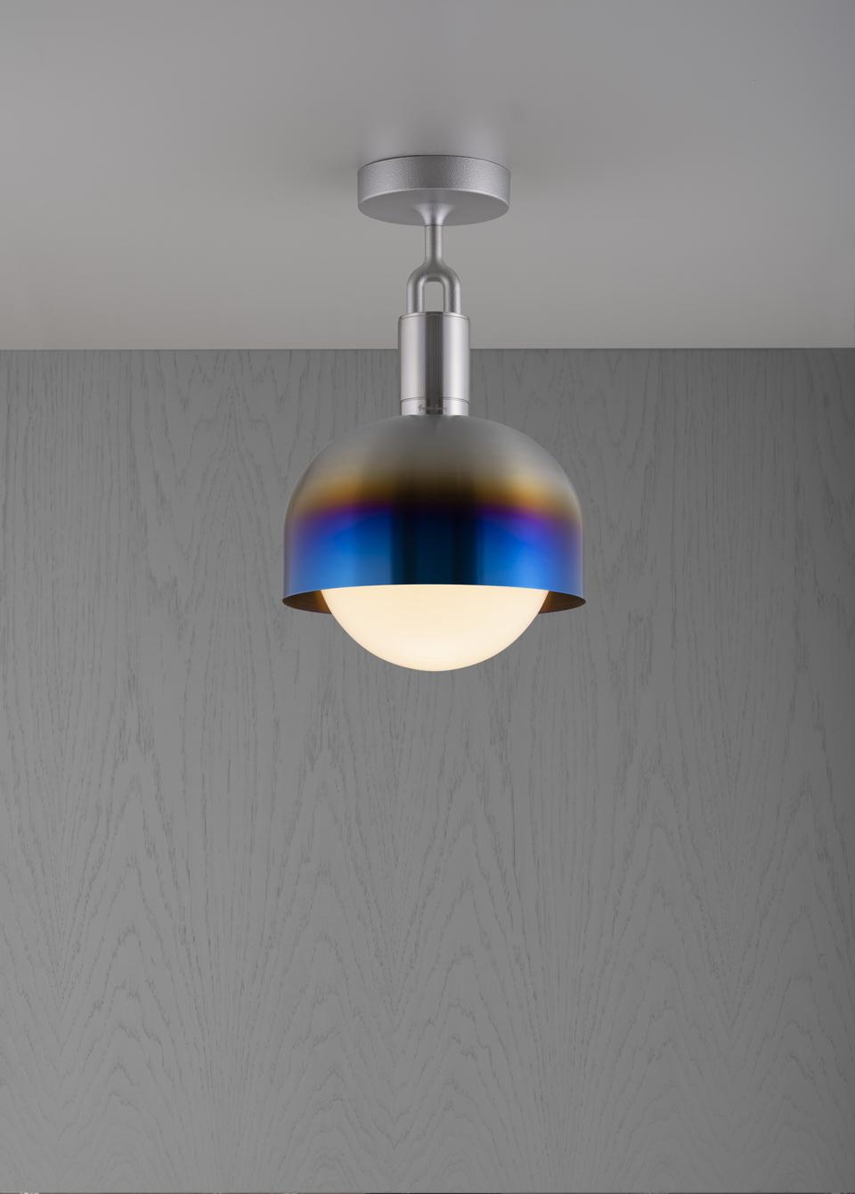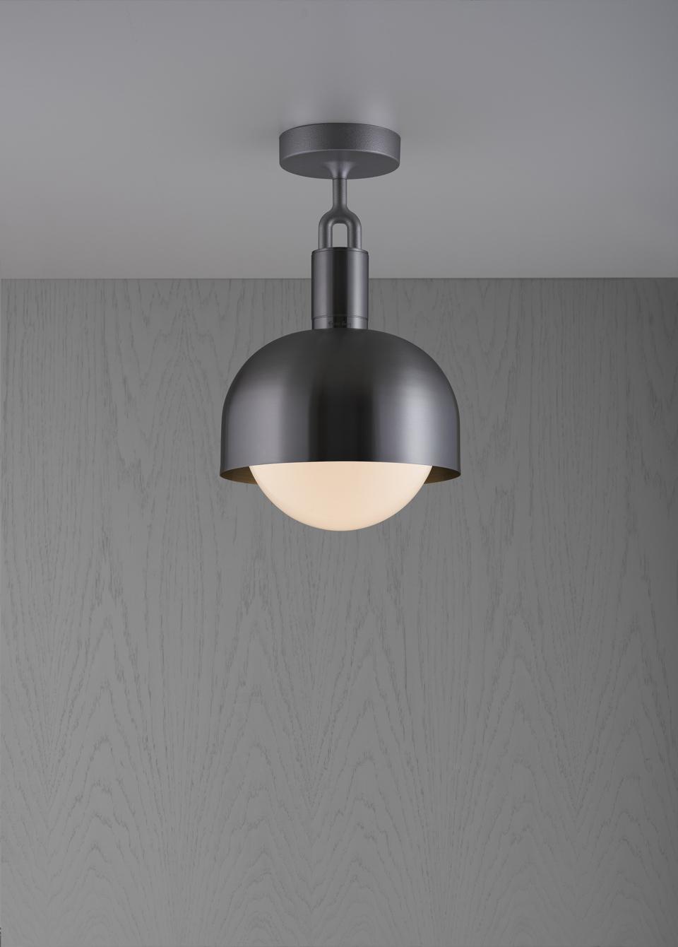 Un plafonnier et un abat-jour, combinant du métal massif usiné, filé à la main et coulé, le tout affiné à la main. Il présente nos détails fourchus moulés et notre moletage linéaire taillé au diamant. La lumière est livrée avec un globe en verre opal soufflé à la bouche et une ampoule Buster à intensité variable spécifique à la fourche, projetant une douce lueur décorative dans cette configuration.