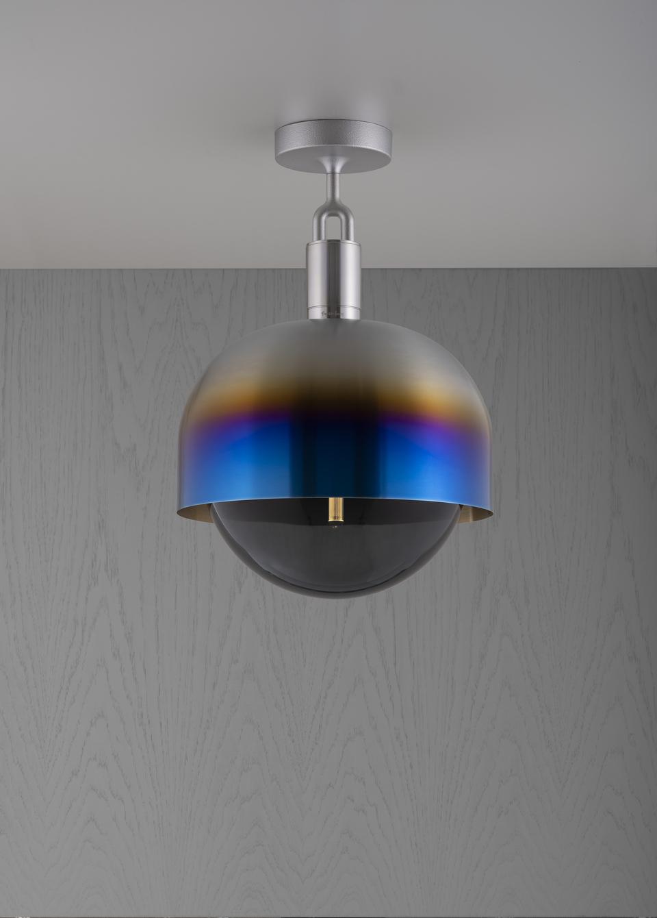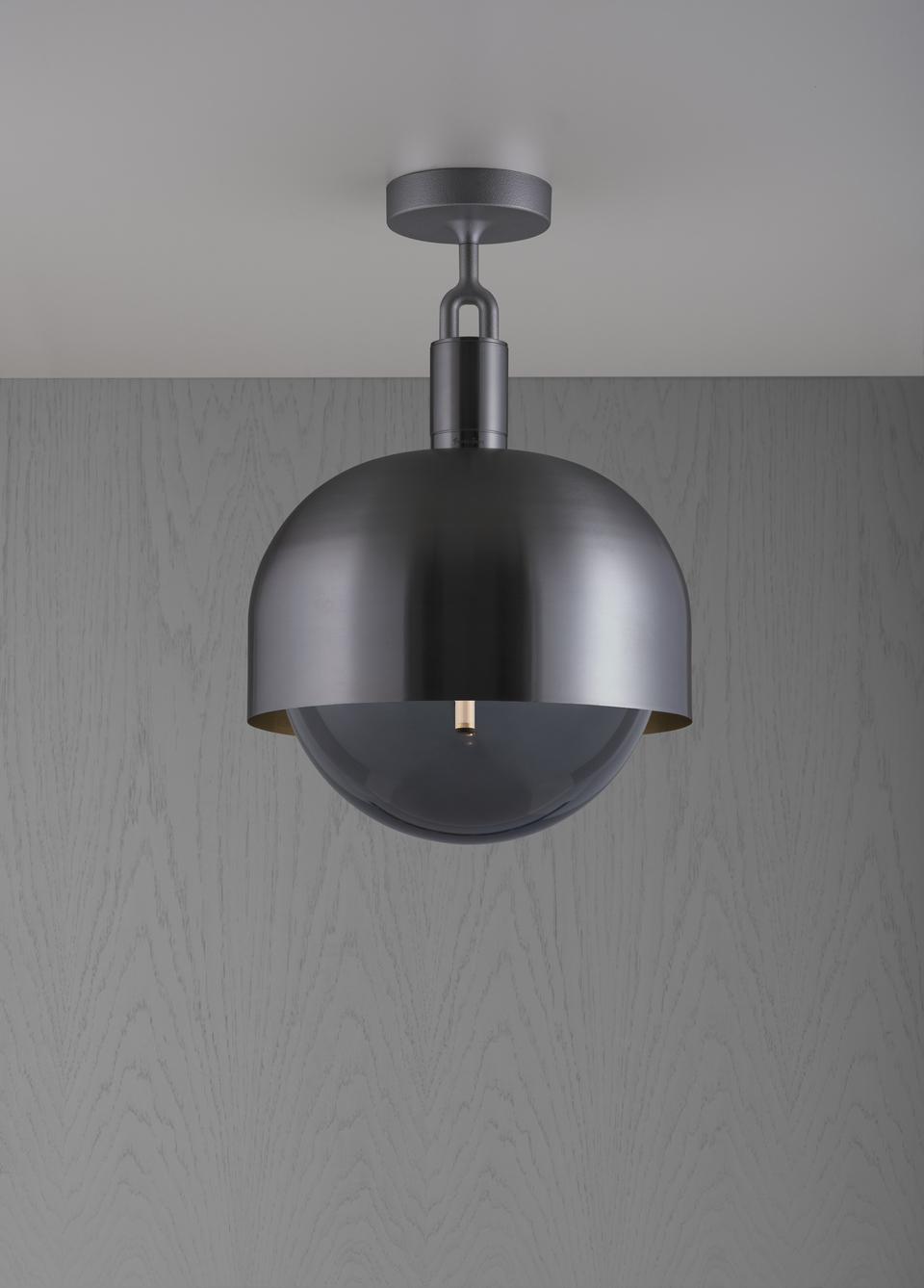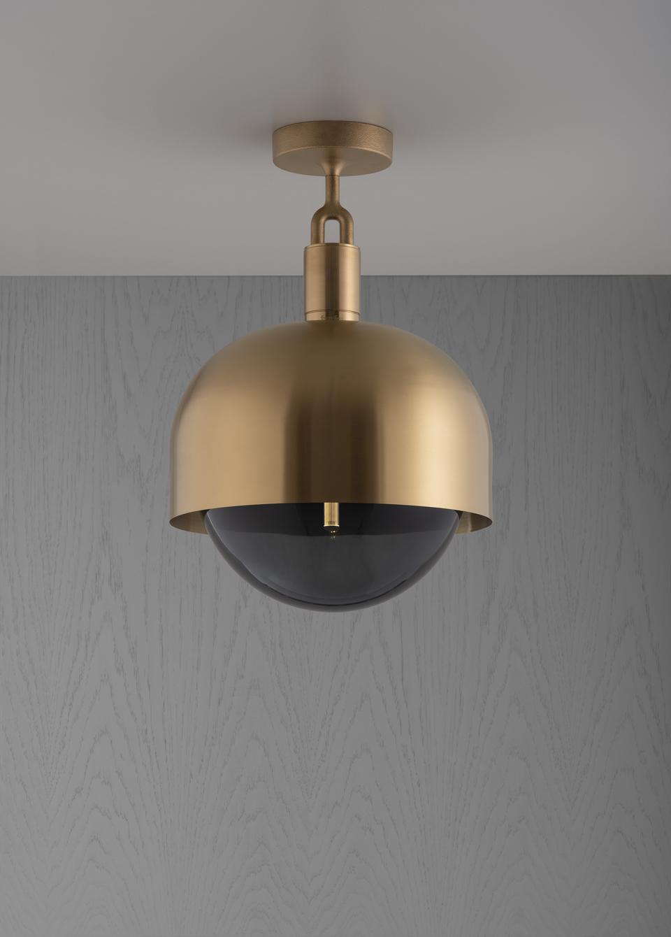 Un plafonnier et un abat-jour, combinant du métal massif usiné, filé à la main et coulé, le tout affiné à la main. Il présente nos détails fourchus moulés et notre moletage linéaire taillé au diamant. La lumière est livrée avec un globe en verre fumé soufflé à la bouche et une ampoule Buster à intensité variable spécifique à la fourche, projetant une douce lueur décorative dans cette configuration.