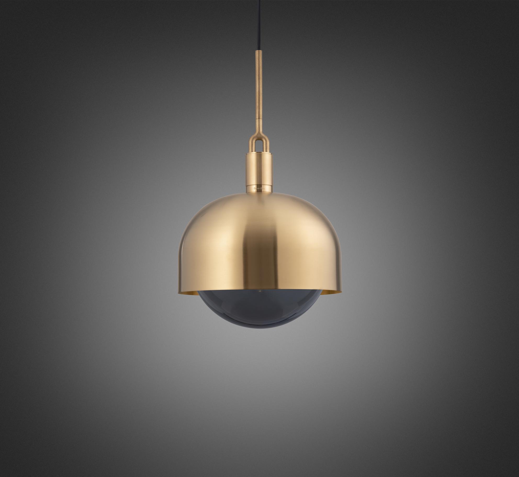 Une suspension lumineuse et un abat-jour, combinant du métal massif usiné, filé à la main et coulé, le tout affiné à la main. Il présente nos détails fourchus moulés et notre moletage linéaire taillé au diamant. La lumière est livrée avec un globe en verre fumé soufflé à la bouche et une ampoule Buster à intensité variable spécifique à la fourche, projetant une lumière ambiante fonctionnelle dans cette configuration