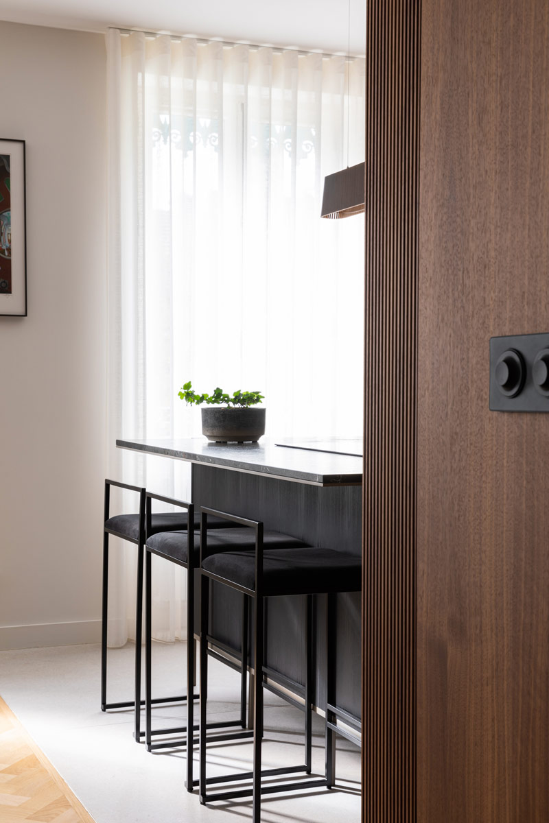 • Bois Brossé Noir : Ces panneaux de revêtement en bois brossé noir ajoutent une touche de modernité et de sophistication à la cuisine. Ils ont été utilisés pour les façades des éléments de rangement et des meubles, créant ainsi un contraste élégant avec les autres matériaux utilisés dans l’espace.