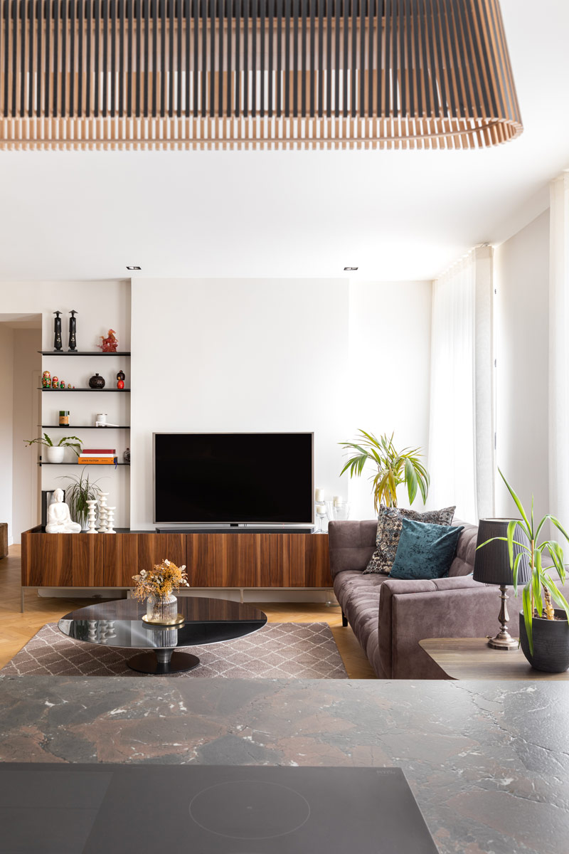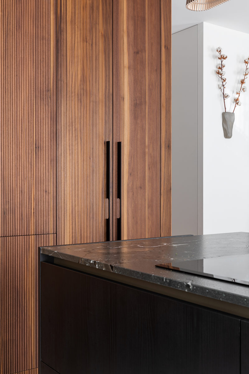 • Latho ASOLO en Noyer US: Les panneaux de bois de noyer américain, du modèle ASOLO, ont été utilisés pour les façades des colonnes de rangement. Leur couleur naturelle et leur texture apportent une touche chaleureuse et authentique à l’espace.